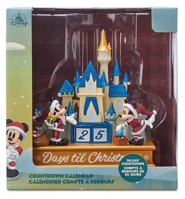 Santa Mickey and Minnie deliver the gift of anticipation as they help build up the excitement to the big day! This holiday countdown calendar includes two numbered cubes and a decorative scene featuring Mickey and Minnie in front of a glittering Fantasyland Castle.