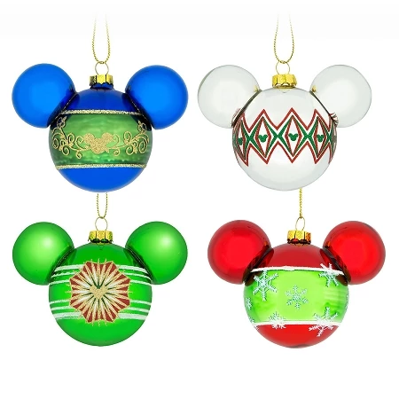 four Mickey Mouse icon ornaments. Each of the glass ornaments features a
