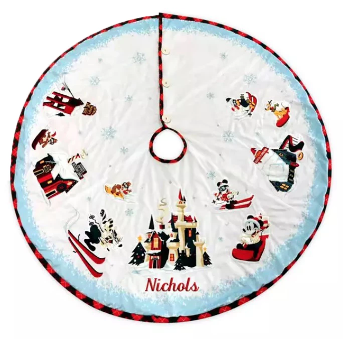 Dress-up the tree with all the traditional joy and splendor of this plush skirt with embroidered Mickey and the gang character art on a velvety bed with embroidered snowflakes and festive trims.