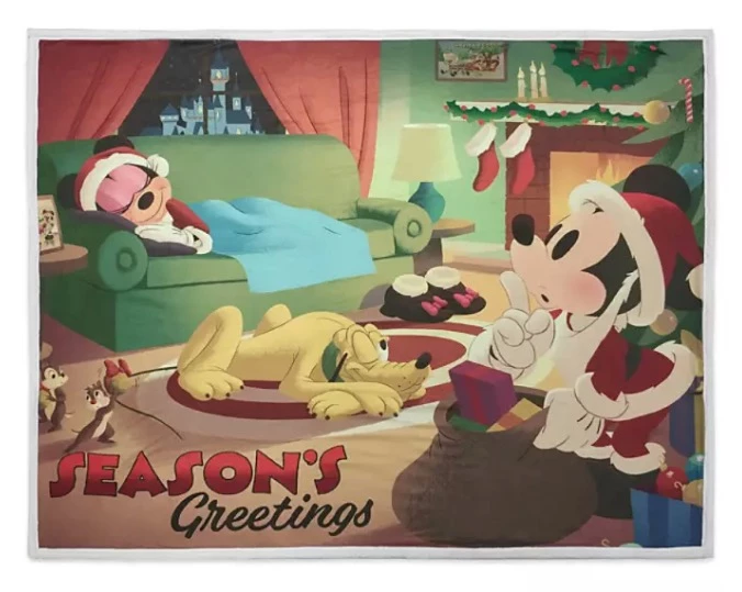 Mickey, Minnie, Pluto, and Chip ‘n Dale share warm season’s greetings on this soft, velvety holiday throw that has an off white backing. Settle in for a long winter’s nap under this comfy blanket.