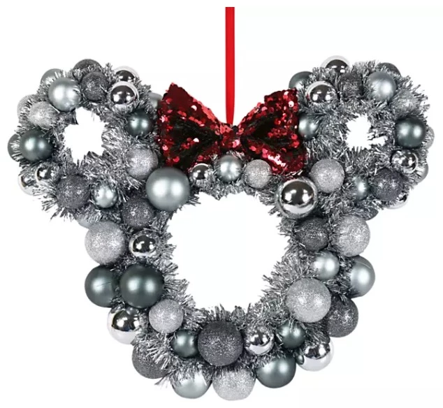 This breathtaking, silvery Minnie icon wreath with sequined bow will add a festive flair to your front door, welcoming carolers and family gatherings to fill your home with magical memories!